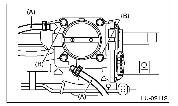 6. Remove the bolts (B) which secure throttle body to intake manifold.