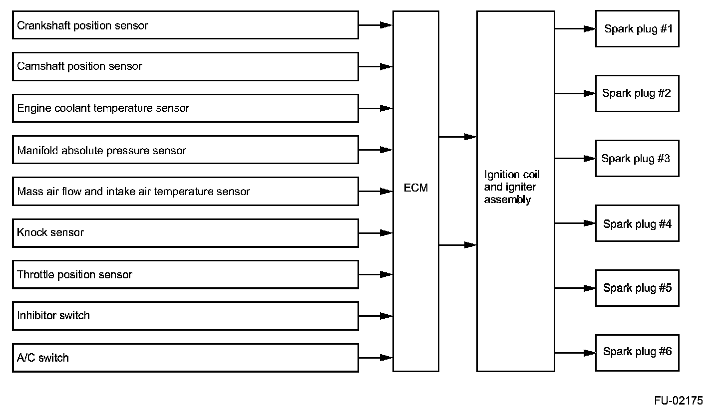 - The ECM outputs an ignition signal for the No.1, No.3 or No.5 cylinder when it receives a cam angle pulse (RH) before a TDC signal and for the No.2, No.4 or No.6 cylinder when it receives a cam angle pulse (LH) before a TDC signal.