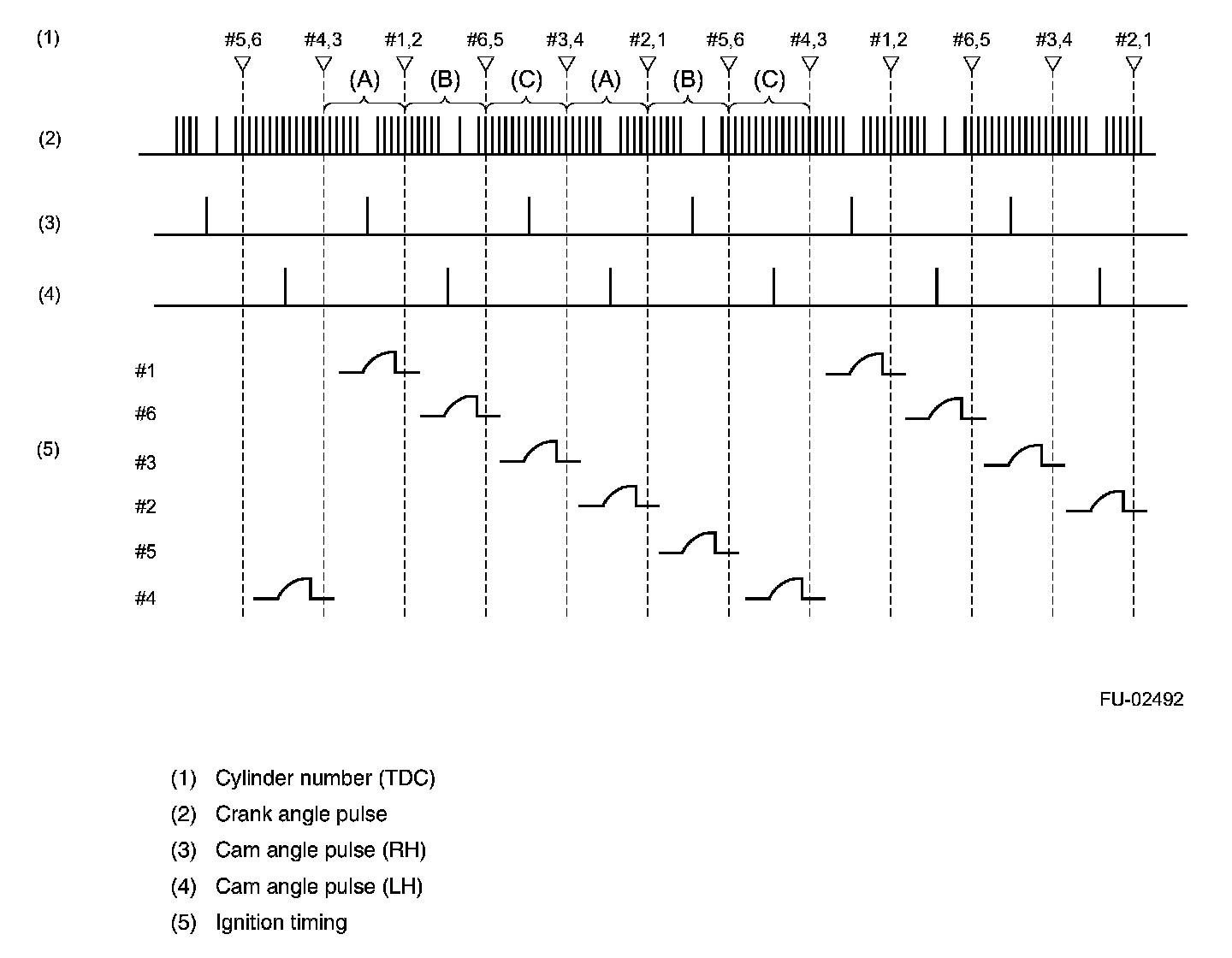 The ECM interprets the pulses of range (A) shown below as the No.1 and No.2 cylinder pistons being at TDC, the pulses of range (B) as the No.5 and No.6 cylinder pistons being at TDC, and the pulses of range (C) as the No.3 and No.4 cylinder pistons being at TDC.
