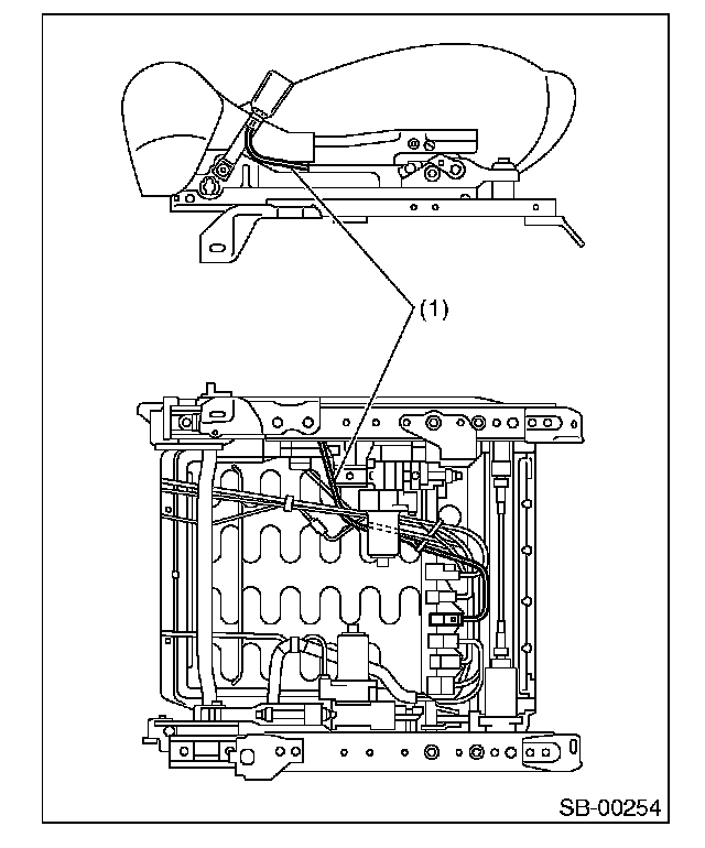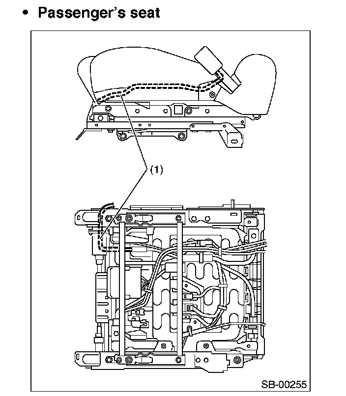 Improper buckle switch function may cause airbag system malfunction. Inner seat belt assembly harness (1) must be routed securely as shown in the figure, since it may affect the performances of seat position sensor and occupant detection system.