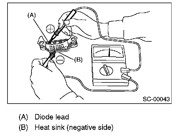 Check for continuity between the negative side, heat sink and diode lead. The negative diode is in good condition if resistance is 1 Ohm or less only in the direction from the heat sink to diode lead.
