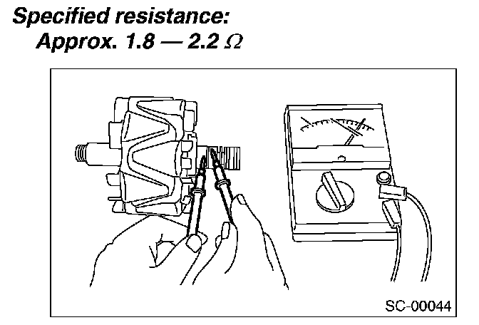Check the continuity between slip ring and rotor core or shaft. If resistance is 1 Ohm or less, the rotor coil is grounded, and so replace the rotor assembly.
