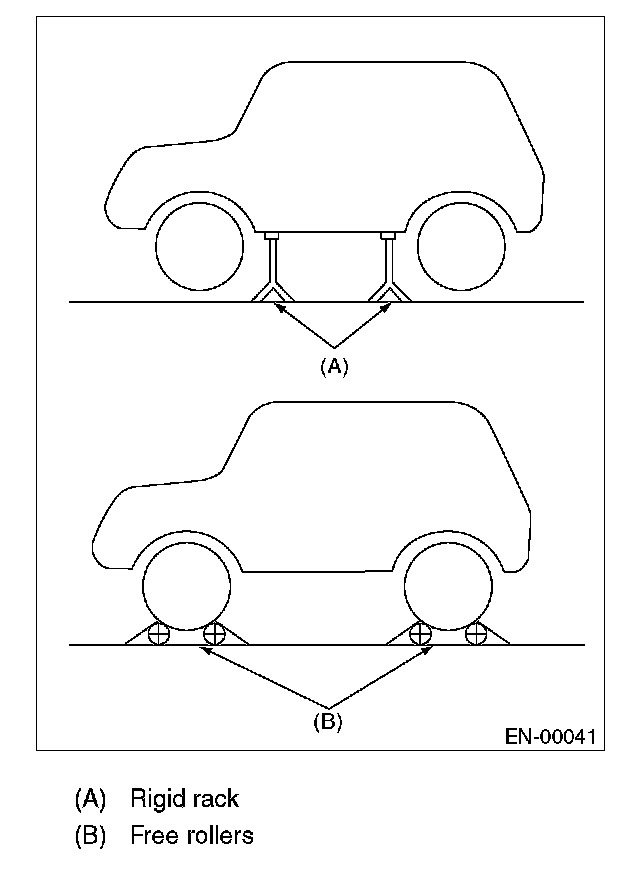 2. Raise the vehicle using a garage jack and place on rigid racks or drive the vehicle onto free rollers.