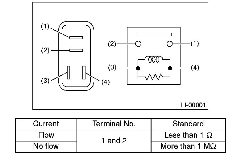 Measure the front fog light relay resistance between terminals when connecting terminal No. 4 to battery positive terminal and terminal No. 3 to battery ground terminal.