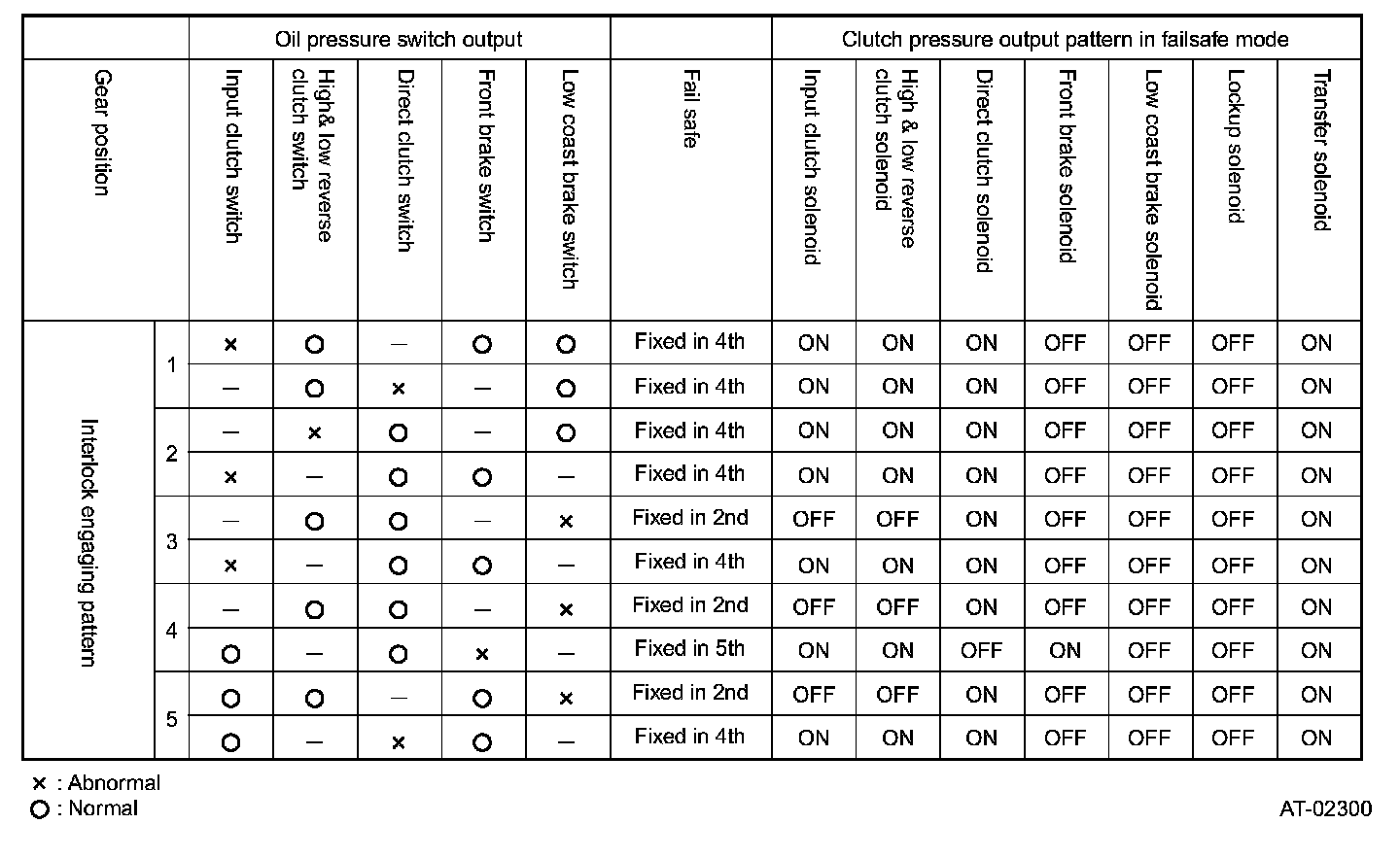If an AT interlock decision is made, the vehicle's minimum mobility is maintained by fixing the transmission in 2nd, 4th or 5th speeds in accordance with the engaging pattern detected by the hydraulic switch. Relation between the hydraulic switch detection pattern and fixed gear speeds are as shown in the table.
