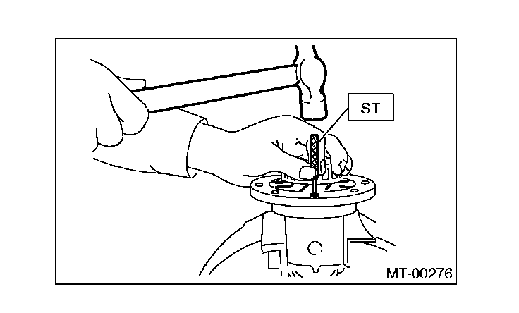 3) Align the pinion shaft and differential case at their holes, and drive the straight pin into holes from the hypoid driven gear side, using ST.