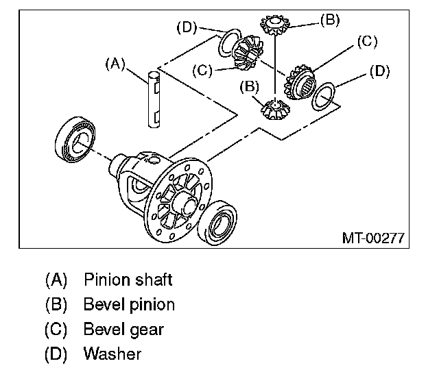 1) Install the differential bevel gear and differential bevel pinion together with washers, and insert pinion shaft.