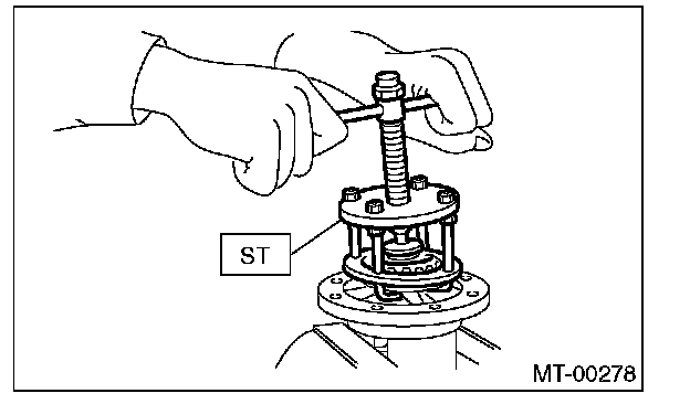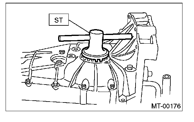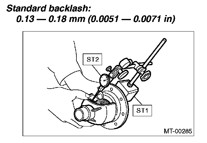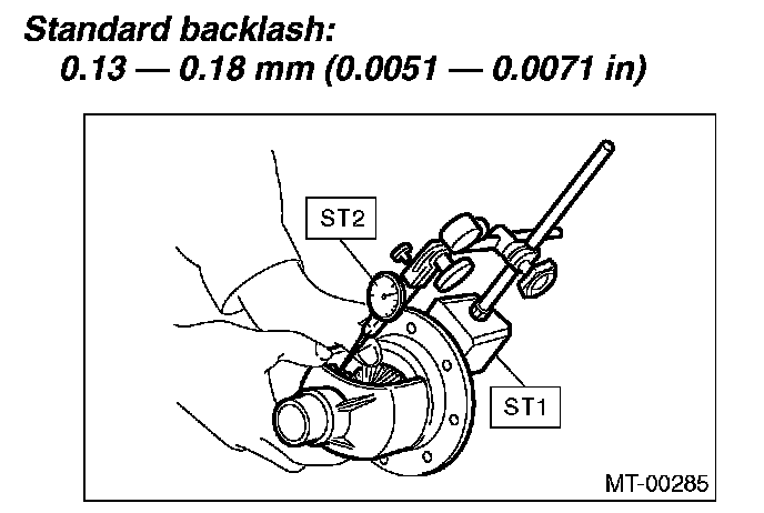 1) Set the ST1, ST2 and ST3. Insert the needle through transmission oil drain plug hole so that the needle comes in contact with the tooth surface at a right angle and check the backlash.
