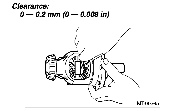 6) Set the drive axle shaft into differential case and hold it using outer spring. Measure the shaft to case clearance to check if it is within specifications using thickness gauge.
