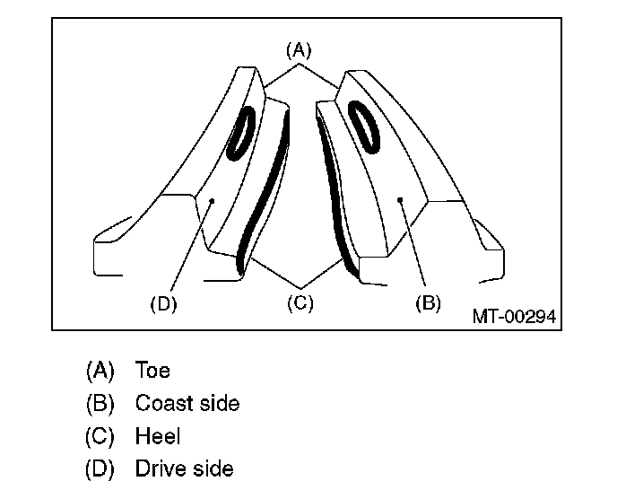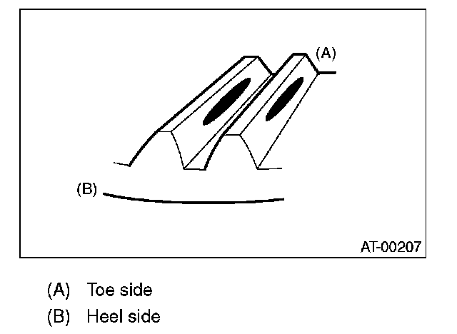 Checking item: Tooth contact pattern is slightly shifted toward to toe side under no-load rotation. [When loaded, contact pattern moves toward heel.]
