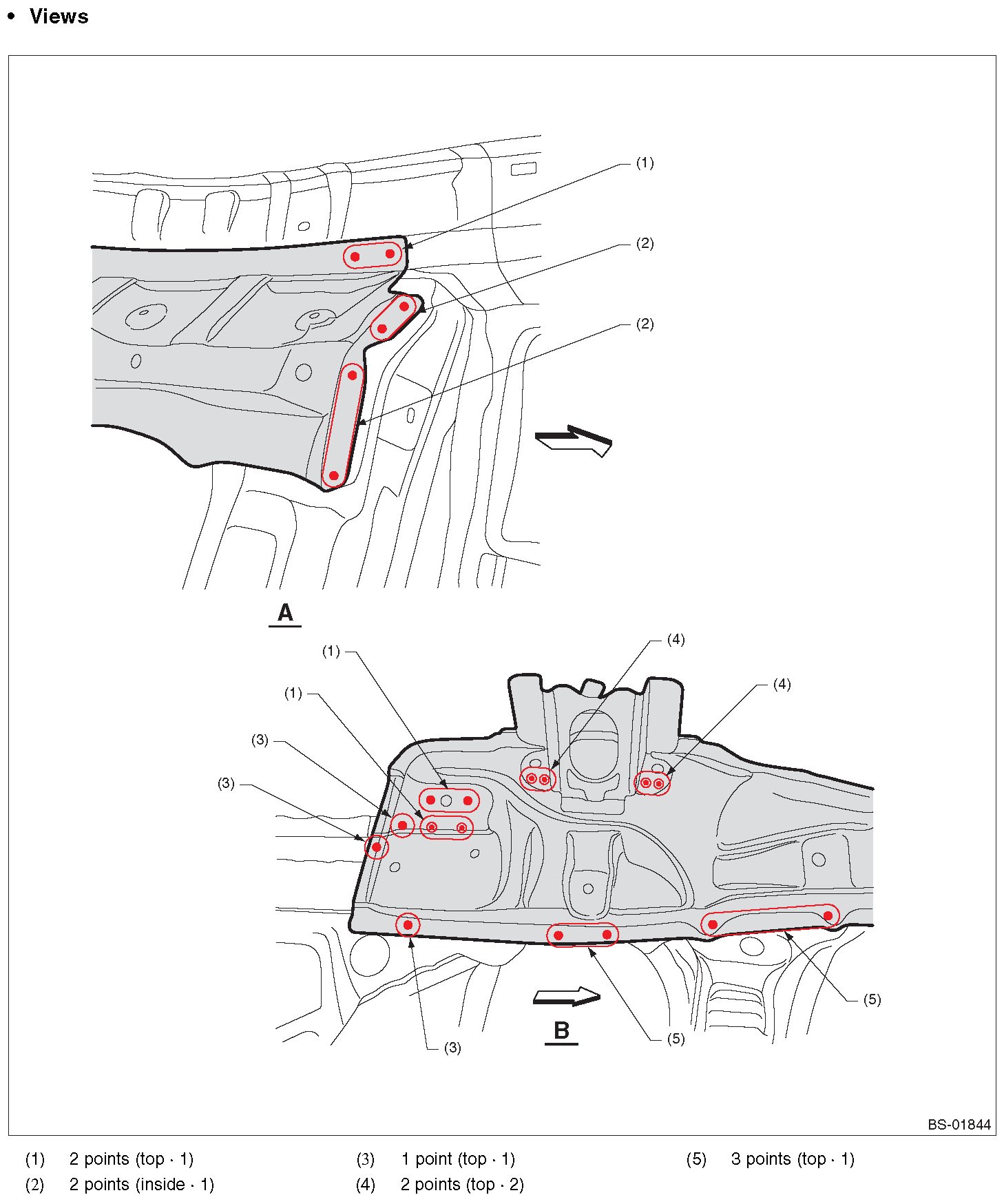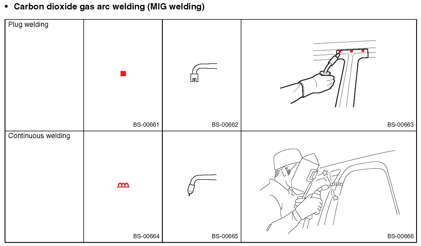 - Symbols and number of points indicate the welding method and the number of welding points. Text in brackets indicate the direction of removal for welded parts, and numbers indicate the number of panels to be drilled to remove welded sections of panels.