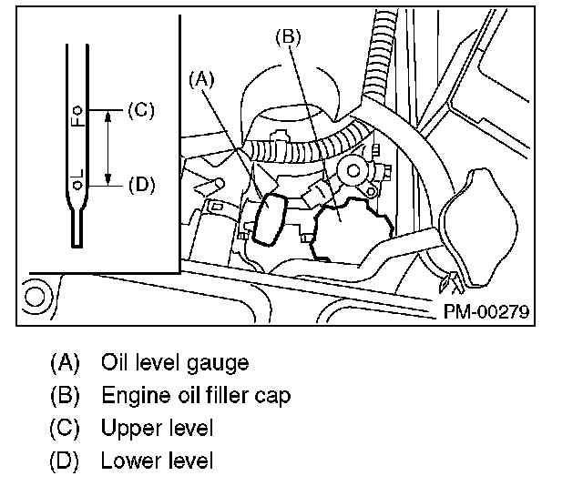 5. Using engine oil of proper quality and viscosity, fill engine oil through the oil filler duct to the upper level on level gauge. Make sure that the vehicle is parked on a level surface when checking oil level.
