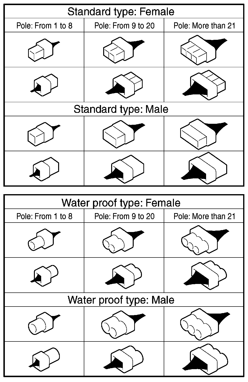 A number of connector symbols are used in each wiring diagram to easily identify the wiring harness connectors.