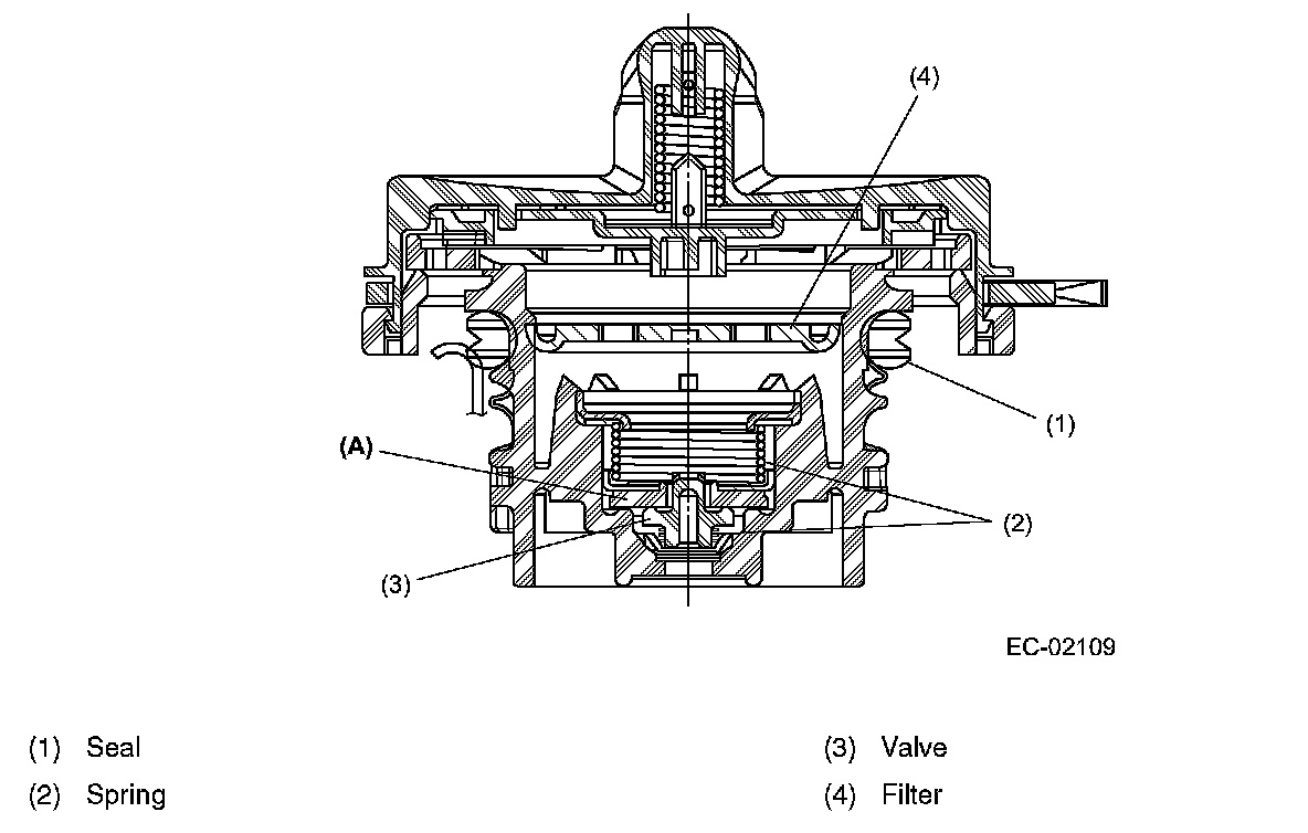 - When there is no problem with the fuel vapor line, the filler pipe is sealed at the portion (A) and by the seal pressed against the filler pipe end. If vacuum develops in the fuel tank, the atmospheric pressure forces the spring down to open the valve; consequently outside air flows into the fuel tank, thus controlling the inside pressure.