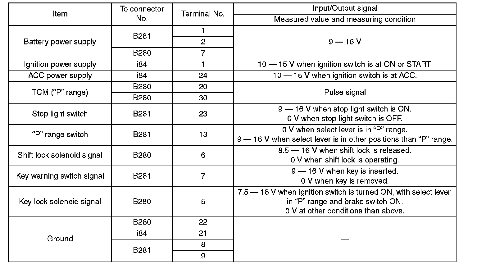 Pinout Values and Diagnostic Parameters