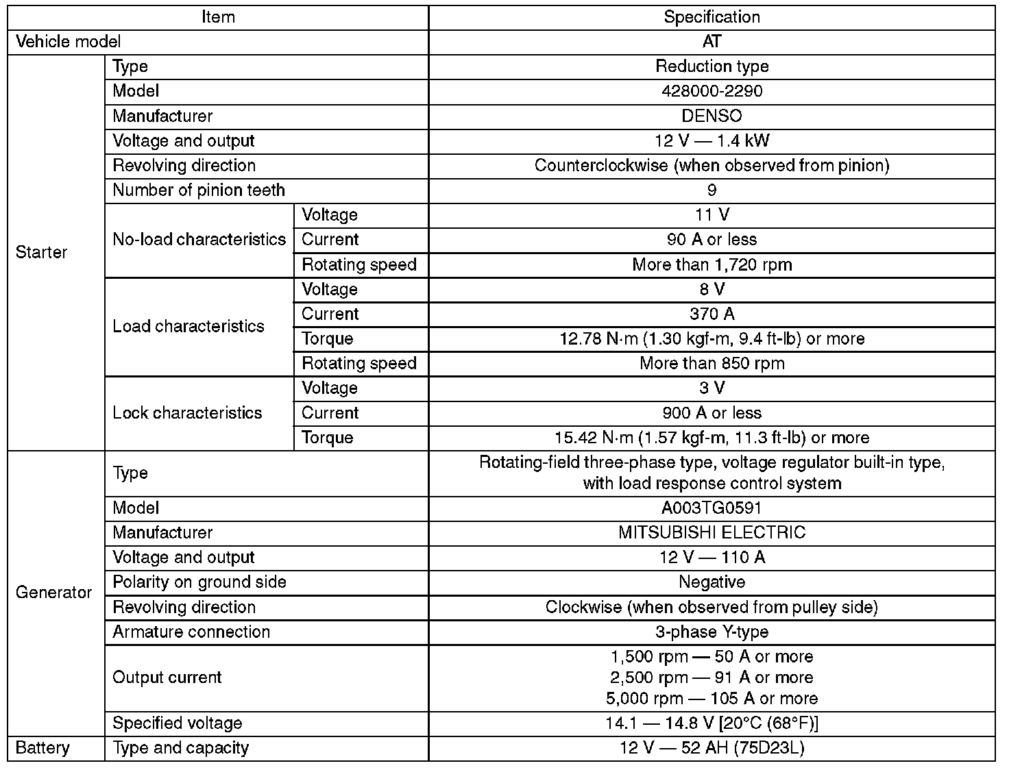 Starting and Charging: Specifications