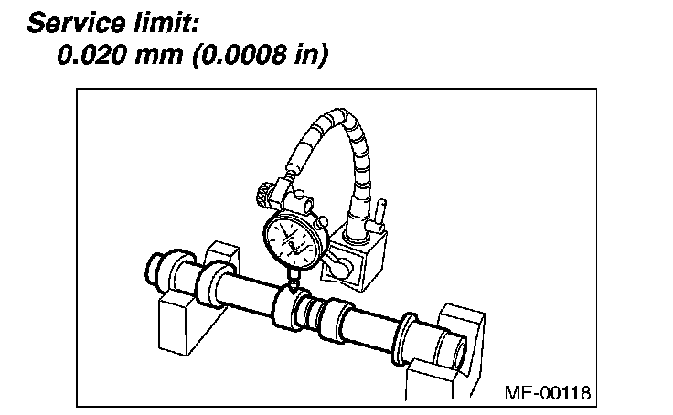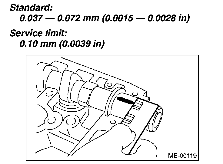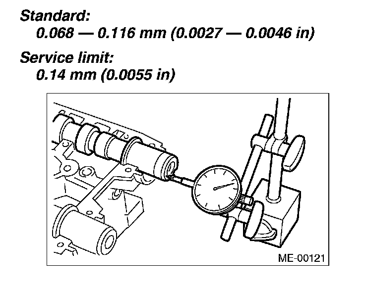 6. Measure the thrust clearance of camshaft with setting the dial gauge at end of camshaft. If the thrust clearance exceeds the limit, replace the caps and cylinder head as a set. If necessary replace the camshaft.