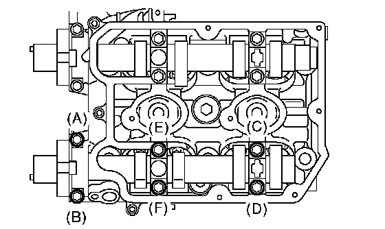 c. Gradually tighten the camshaft cap and oil control valve assembly in at least two stages in alphabetical sequence shown in the figure, and then tighten to specified torque.
