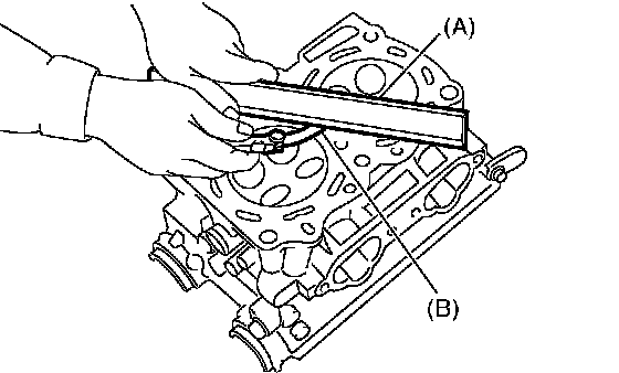 2. Measure the warping of the cylinder head surface that mates with crankcase using a straight edge (A) and thickness gauge (B).