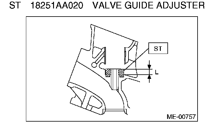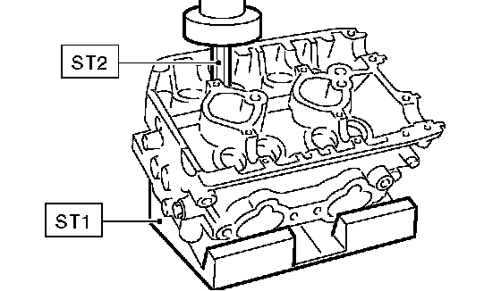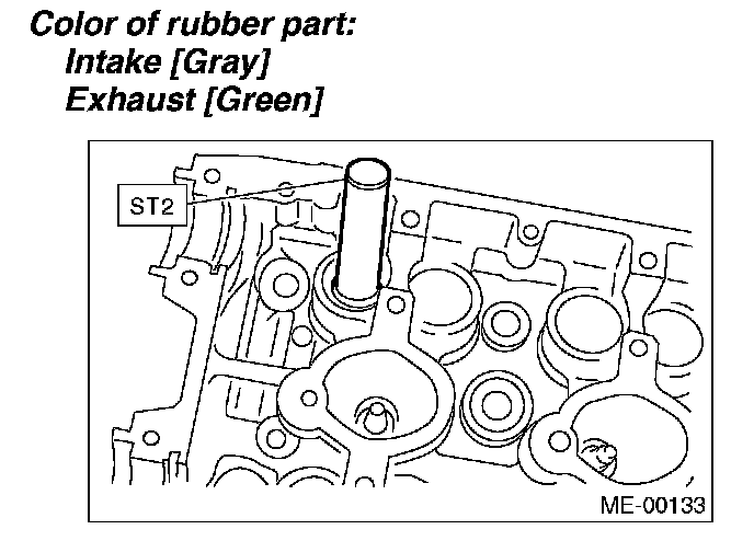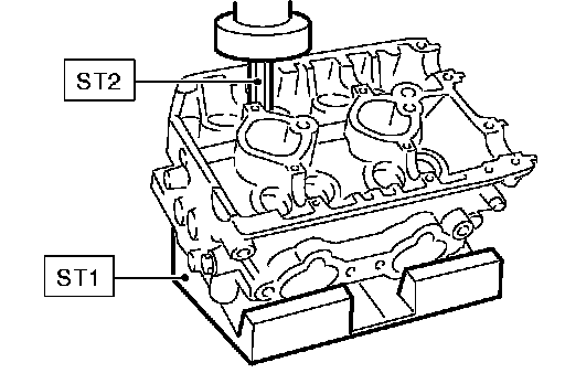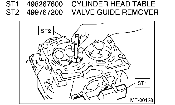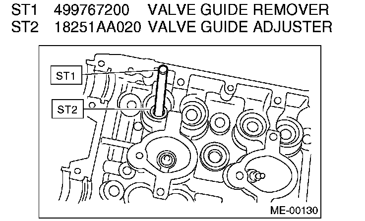 e. Put a new valve guide, coated with sufficient oil, in the cylinder head, and insert the ST1 into valve guide. Press in until the valve guide upper end is flush with the upper surface of ST2.