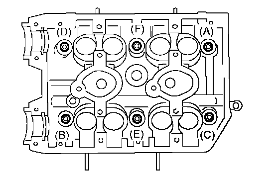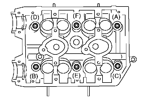 9. Remove the cylinder head bolts in alphabetical sequence shown in the figure. Leave the bolts (A) and (D) engaged by three or four threads to prevent the cylinder head from falling.