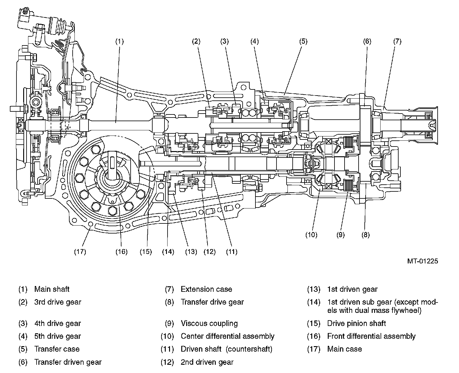 GeneralThe manual transmission is of a full-time all-wheel-drive design integrating a transmission assembly, front differential, and transfer gear assembly with center differential into a single unit. The transmission has five forward speeds and one reverse speed, and all gears are provided with inertia lock type synchronizers.