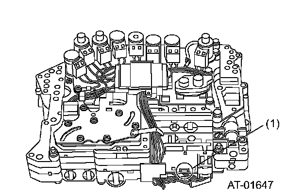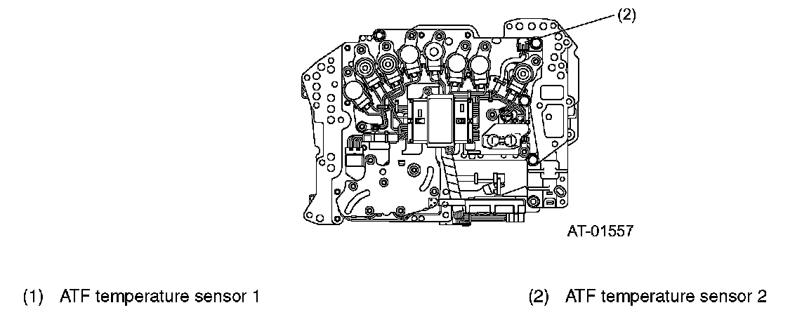 ATF TEMPERATURE SENSOR 1, 2These temperature sensors are thermistors and each of them is mounted on the control valve body. ATF temperature sensor 1 detects the ATF temperature in the oil pan, and ATF temperature sensor 2 detects the ATF temperature at the torque converter outlet; each sensor outputs electrical resistance signals.