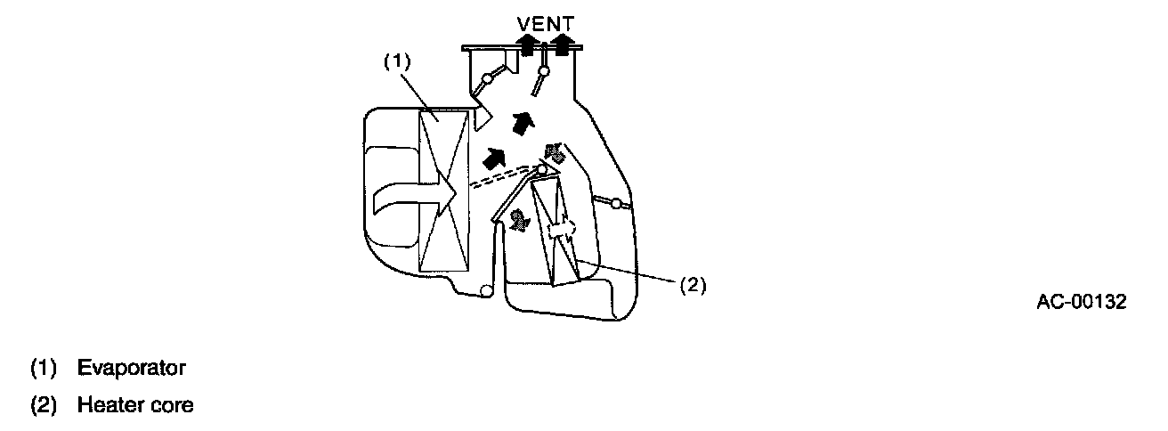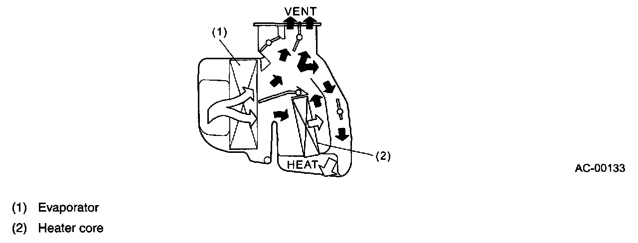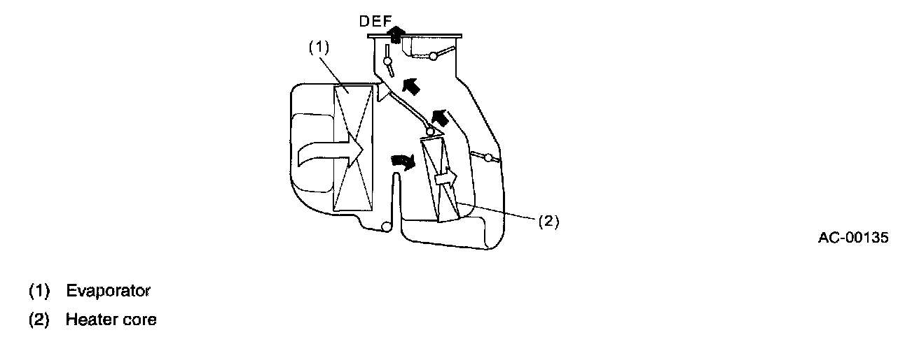 - The air from the evaporator passes through the heater core and the warmed air flows through the defroster door to the defroster (DEF) duct.