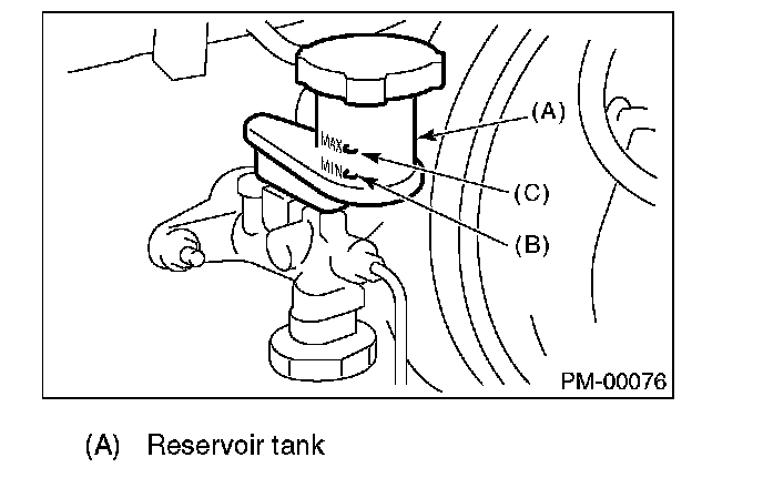 2. Inspect the fluid level using the scale on the outside of the reservoir tank. If the level is below "MIN", add fluid to bring it up to "MAX", and also inspect for leakage.