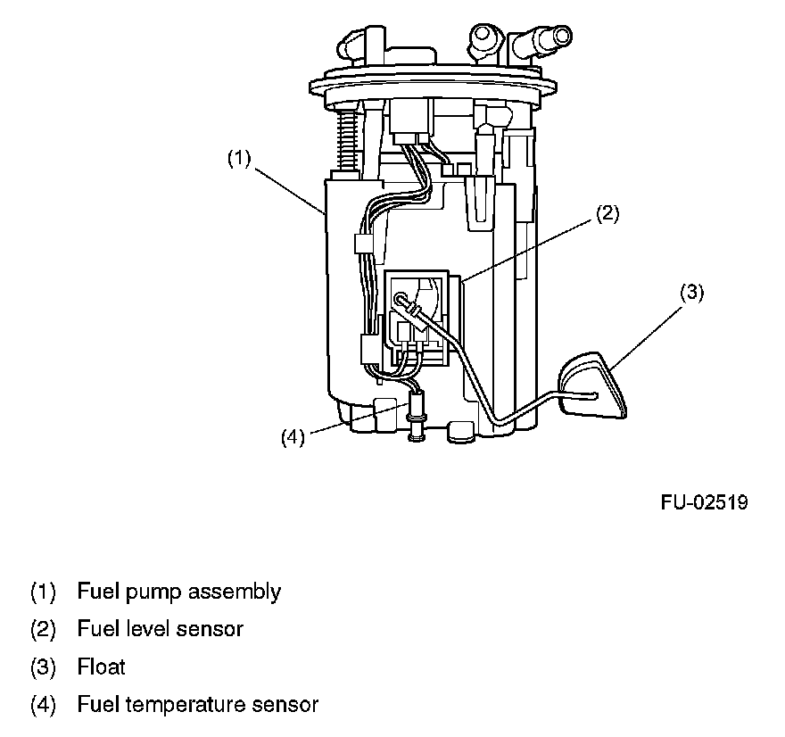 The fuel level sensor is integrated with the fuel pump, which is located in the fuel tank. The sensor outputs an electric resistance signal that varies with movement of its float to indicate the level of the fuel remaining in the tank.