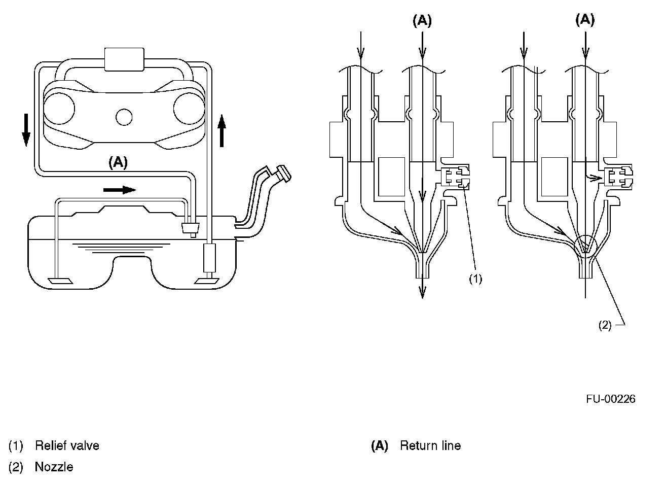 - When the return line nozzle is clogged, the fuel sent back through the return line flows back into the fuel tank via the relief valve.