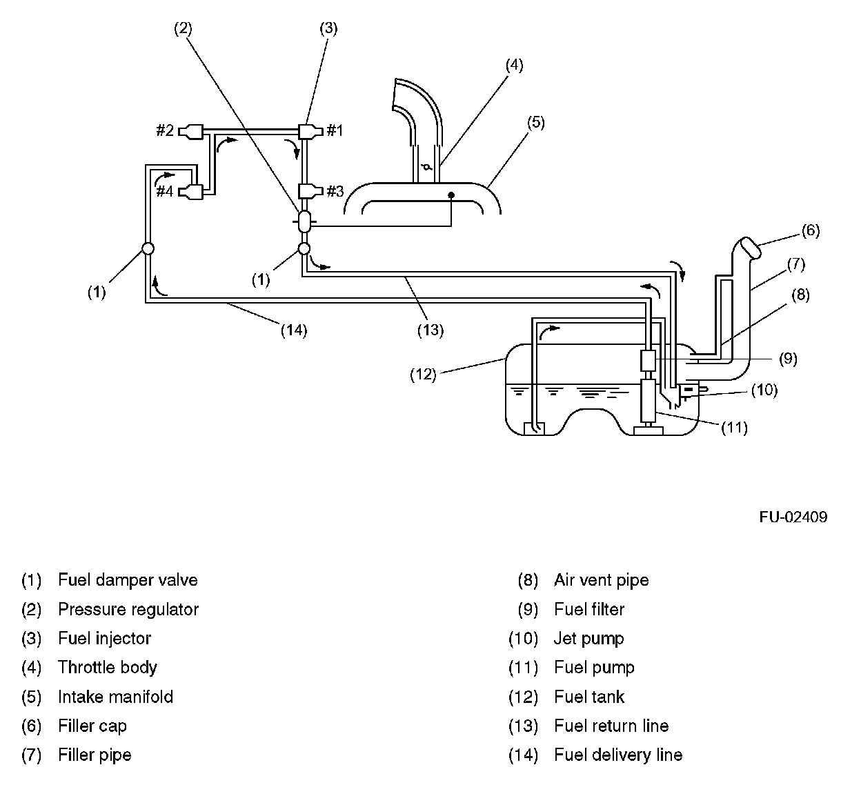 GENERAL- The fuel pressurized by the fuel tank inside pump is delivered to each fuel injector through the fuel filter. Fuel injection pressure is regulated to an optimum level by the pressure regulator.