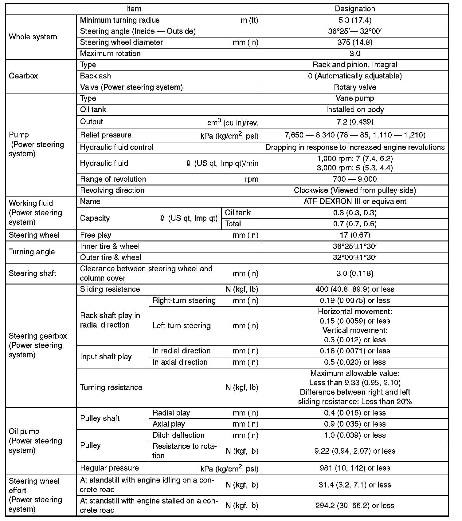 General diagnostic table lists various clearances that must be correctly adjusted to ensure the normal vehicle driving without interfering noise, or any other faults.