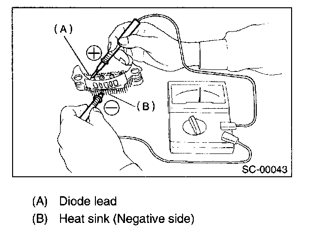 Check for continuity between the negative side heat sink and diode lead. The negative diode is in good condition if resistance is 1 Ohm or less only in the direction from the heat sink to diode lead.