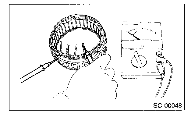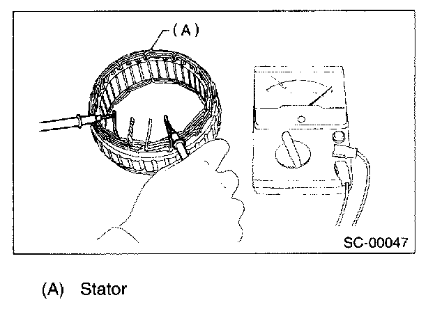 Inspect the stator coil for continuity between stator core and each end of lead wire. If resistance is 1 Ohm or less, the stator coil is grounded, and so replace the stator assembly.