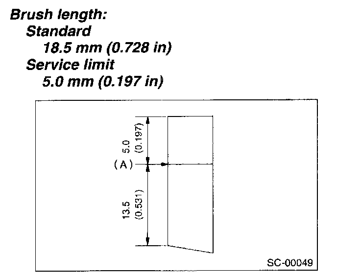 1. Measure the length of each brush. If wear exceeds the service limit, replace the brush. Each brush has the service limit mark A. on it.