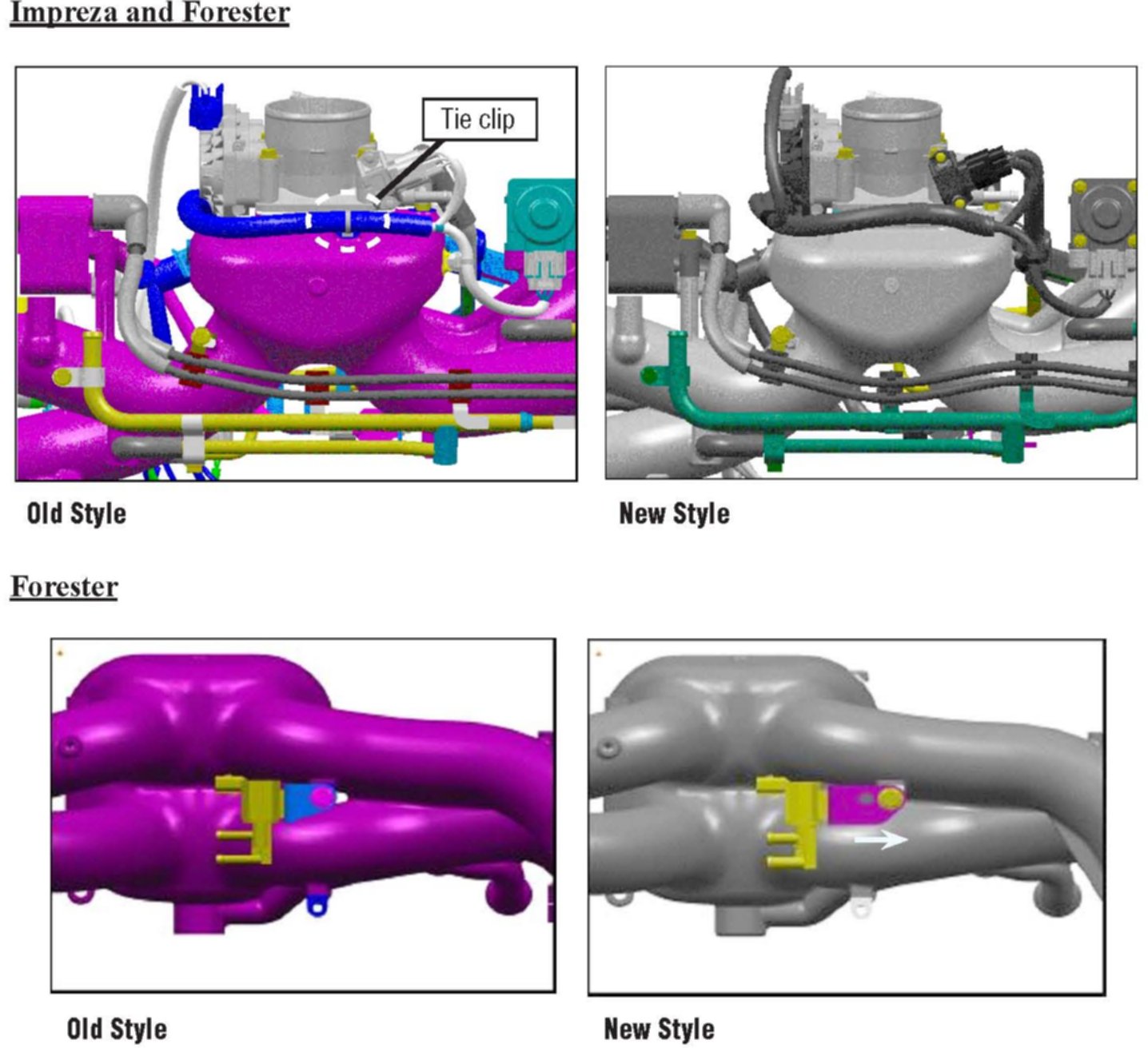 The purpose of this bulletin is to inform you of a modification which was made to the intake manifold. The boss and tie clip that secured the engine harness to the intake manifold was removed. In addition, on Forester models the mounting position of the purge control solenoid valve bracket was slightly moved to the right. Due to the modification the shape of the bracket was changed. Therefore, if the intake manifold is replaced, the purge control solenoid valve will also need to be replaced.