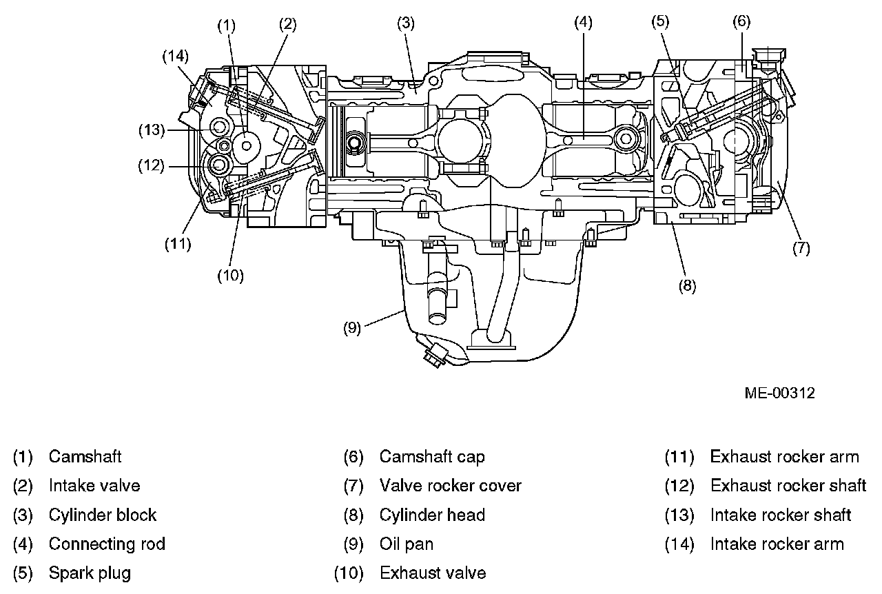GeneralThe engine used in this vehicle is of a horizontally opposed, four-cylinder design. This four-strokecycle, water-cooled, DOHC turbocharged engine uses a total of 16 valves and its main components are made of aluminum alloy. It is fueled by a multiple fuel injection system.