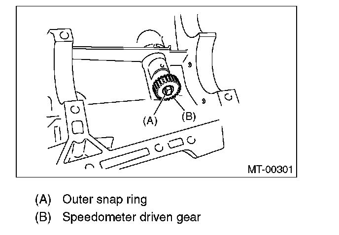 6) Remove the outer snap ring and pull out speedometer driven gear. Next, remove the oil seal, speedometer shaft and washer.