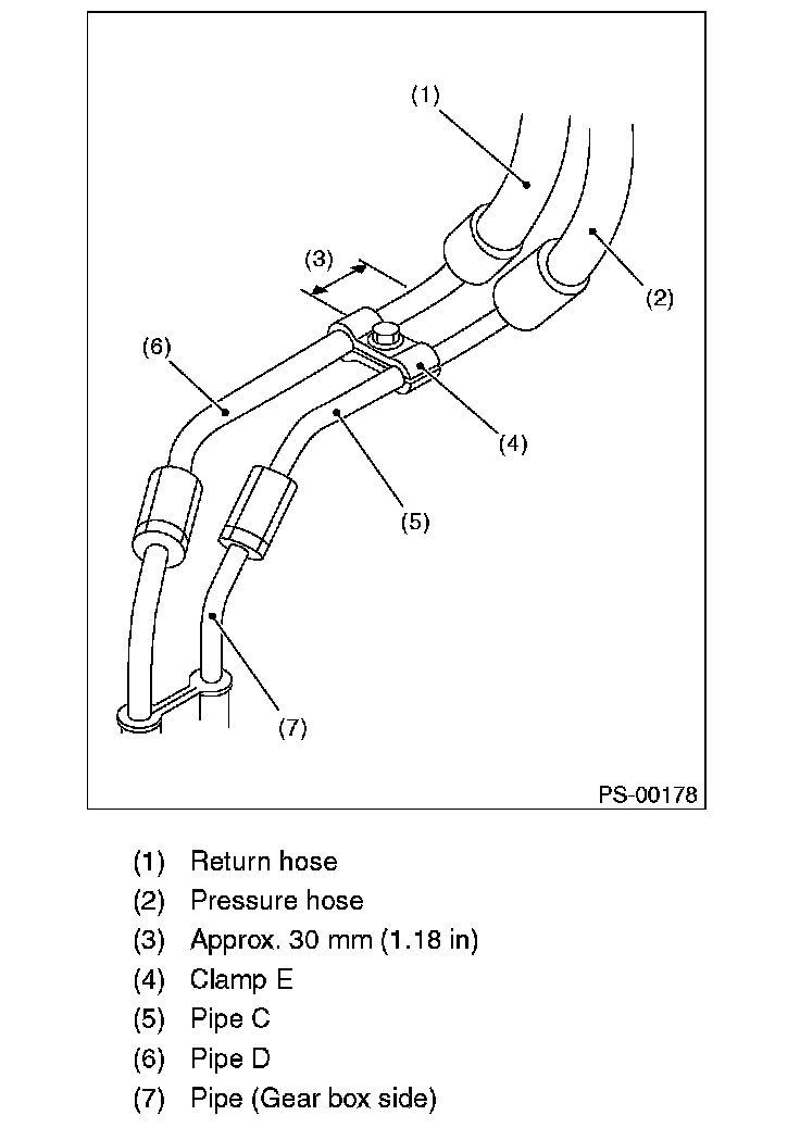 13) Finally check clearance between pipes and/or hoses, as shown above. If cruise control actuator-to-power steering hose clearance is less than 10 mm (0-39 inch), move the portion (A) secured by clamp to other portion, or bend portion (B) to adjust.