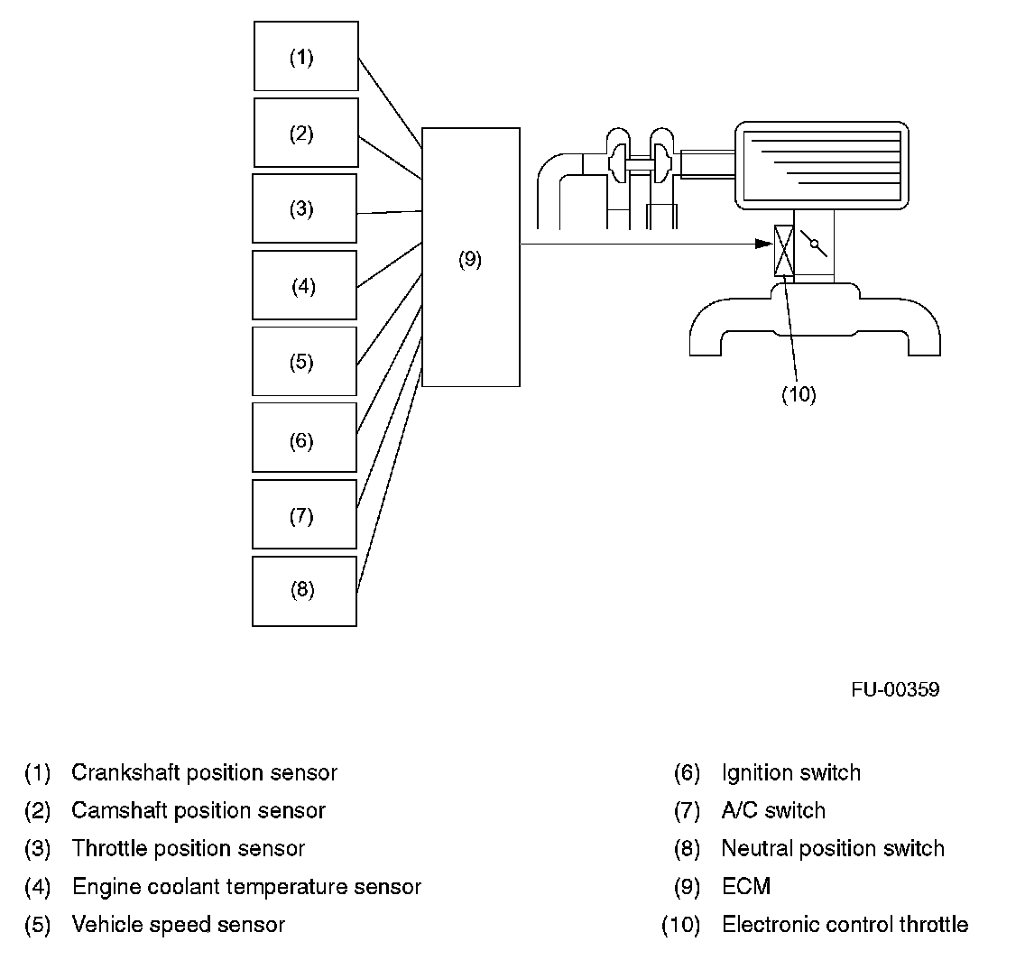 IDLE AIR CONTROL- The ECM controls the electronic control throttle based on signals from the crankshaft position sensor, engine coolant temperature sensor, air flow sensor, manifold absolute pressure sensor and A/C switch so that the proper idle speed for each engine load is achieved.