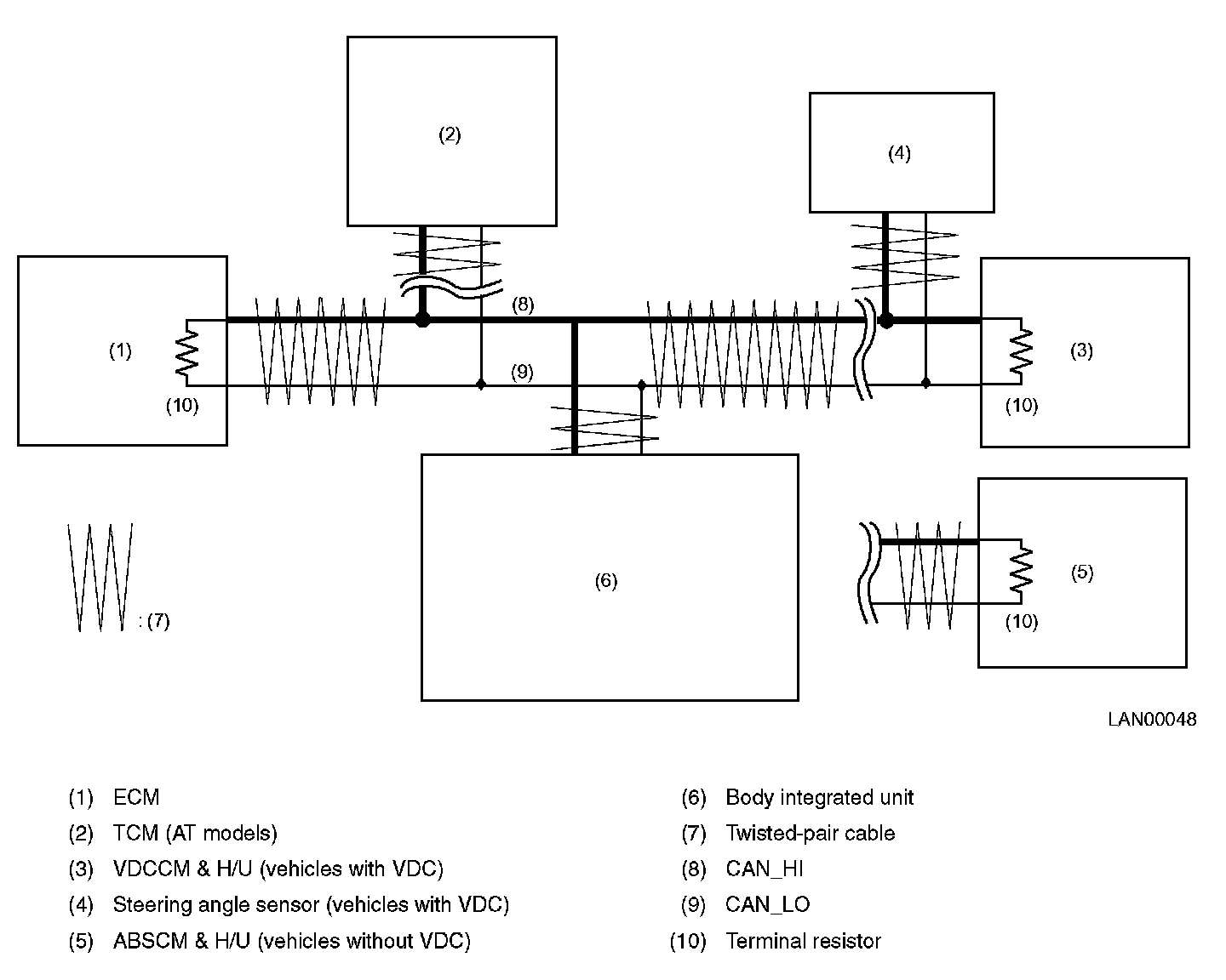 - Terminal resistors built into the ECM and VDCCM &H/U stabilize traffic on the bus, and enables signals distinction from the voltage difference between the two bus lines (CAN_High and CAN_Low). These bus lines are called the main lines. Other units are connected in parallel to the main lines. These wires are called branch lines.