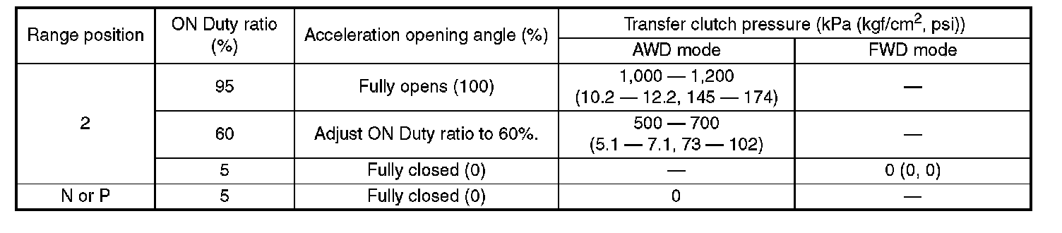 Check transfer clutch pressure using the following chart.