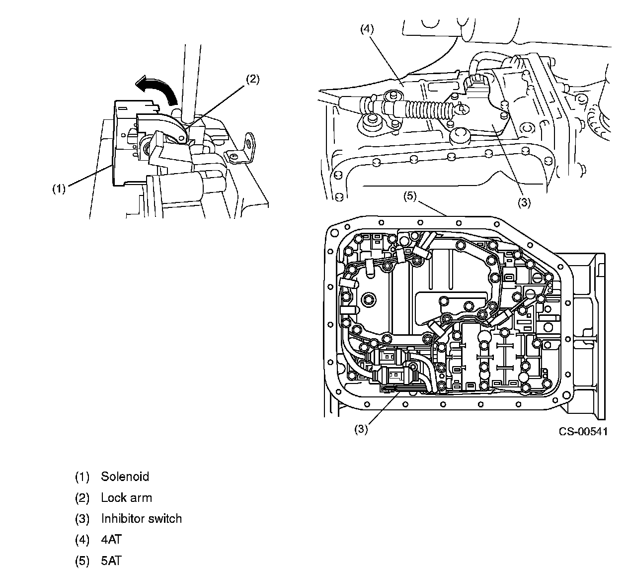 SHIFT LOCK SYSTEM OPERATIONThe shift lock system has a solenoid-operated plunger (1). With the select lever in the P position, the plunger remains extended, holding the lock arm (2) in its pushed out (locking) position. When the brake pedal is depressed with the ignition switch in either the ON or START position, the solenoid is energized and the plunger is retracted. This causes the lock arm to lift to the select lever release position. The select lever now can be moved to any other position. The P position of the select lever is detected by the inhibitor switch (3).