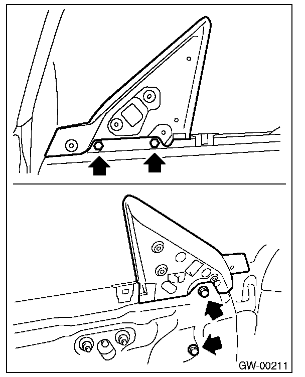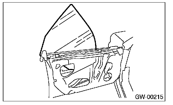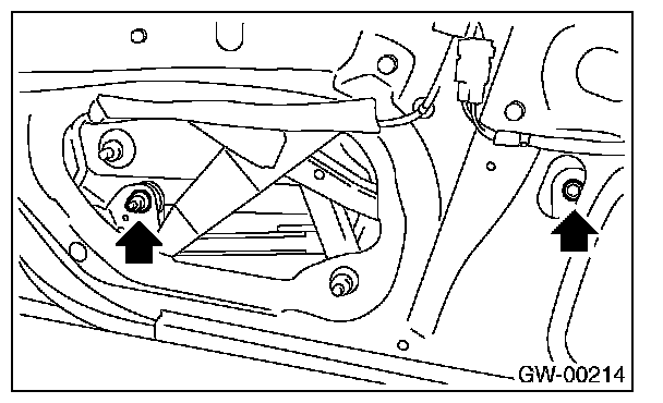 7. Operate the power window switch to move the glass to position shown in the figure, and then remove the two nuts from service holes.