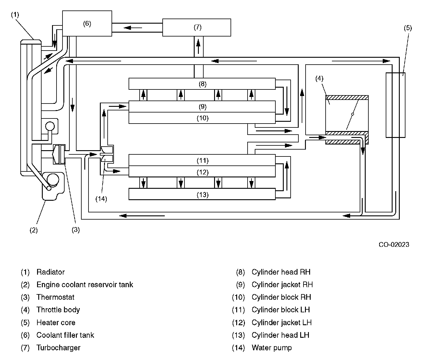 When the engine coolant temperature sensor becomes hotter than the preset value, the ECM receives signals from the engine coolant temperature sensor and causes the radiator fan(s) to operate. When the engine is stopped after high-speed operation, vapor produced in the turbocharger cooling section flows from the coolant filler tank to the reservoir tank where it condenses back into water. Water is then absorbed by the coolant filler tank as the engine cools down.
