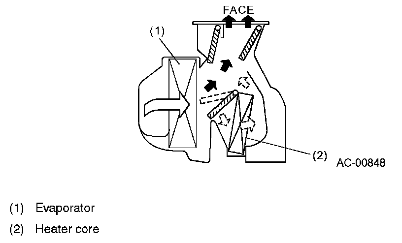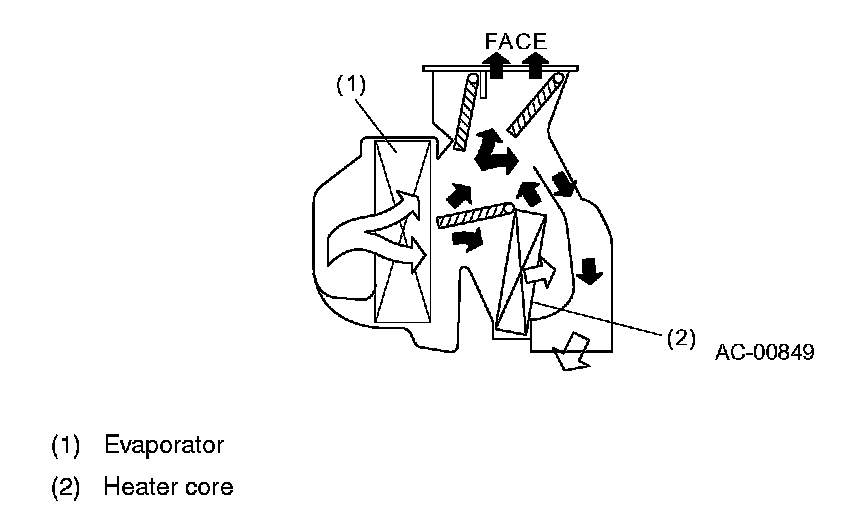 - The air that has flown through the evaporator is divided into two directions. Part of this air flows through the heater core and becomes warm air. The rest of the air goes to the outlet as cool air, however, this is mixed with the warm air from the heater core. The mixed air then flows to the ventilation and heater ducts.