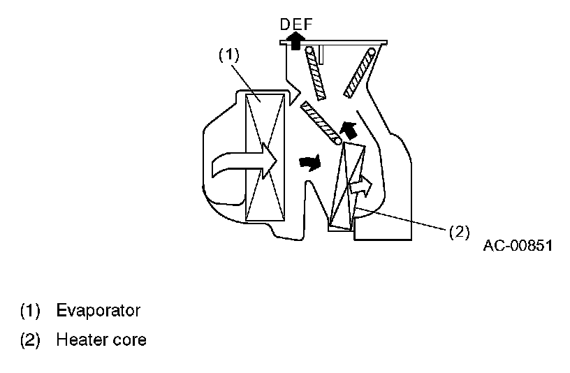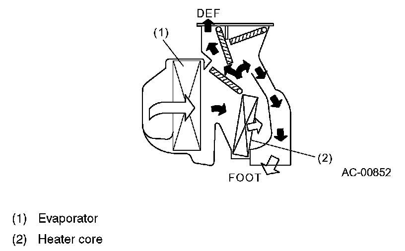 - The air from the evaporator flows through the heater core and the warmed air flows to the defroster (DEF) duct and foot duct to defog the windshield while sending warm air to the legs.