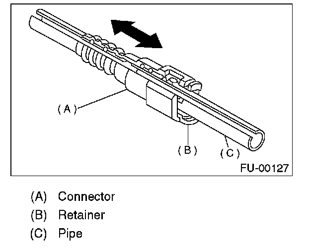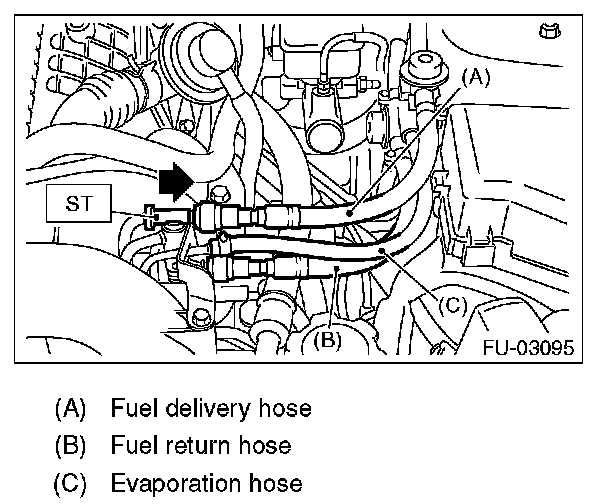 3. Insert the back side of ST into the quick connector and push ST in the direction of arrow mark to disconnect the fuel return hose.