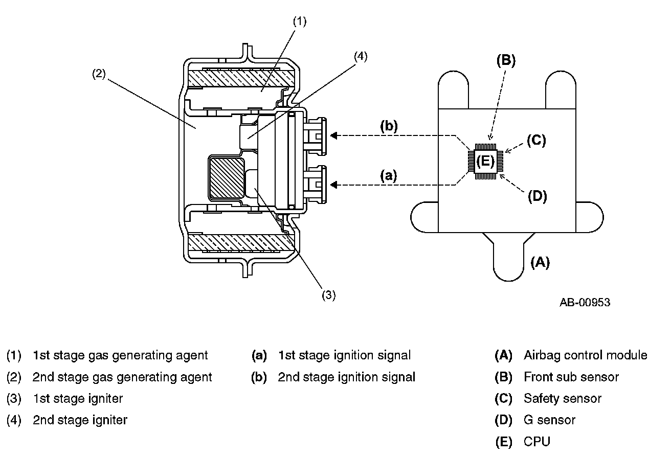 The inflator houses igniters and gas generating agents in a metal container. Igniters and gas generating agents are placed at two locations, and a 2-stage inflator which controls the airbag inflating speed according to the magnitude of impact at a collision is used. If the impact detected by the airbag sensor is equivalent to the level detected at a high speed, sudden collision, the two gas heating agents are ignited simultaneously. If the event of a collision at low or mid speed, the ignition of the 2nd stage gas generating agent is delayed to reduce the output of the inflator. Thus the inflator outputs power suitable for the severity of collision and relieves the impact to the passenger's head or upper body.
